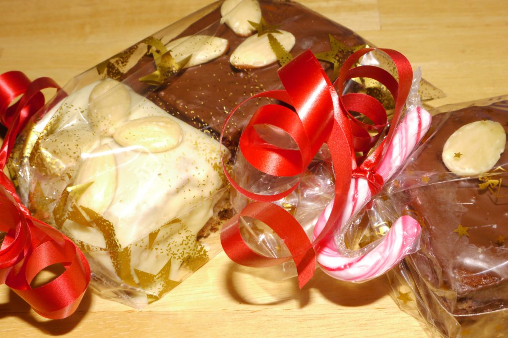 Lebkuchen im Ganzen pur servieren, mit Puderzucker oder Schokoguss. Für die Lebkuchenschnitten (siehe Fotos) den Kuchen in kleine Quadrate schneiden, Schokolade im Wasserbad schmelzen und die Schokolade mit einem kleinen Löffel oder einem Pinsel auf den Lebkuchen (und in der ganzen Küche) verteilen und mit Mandeln verzieren.