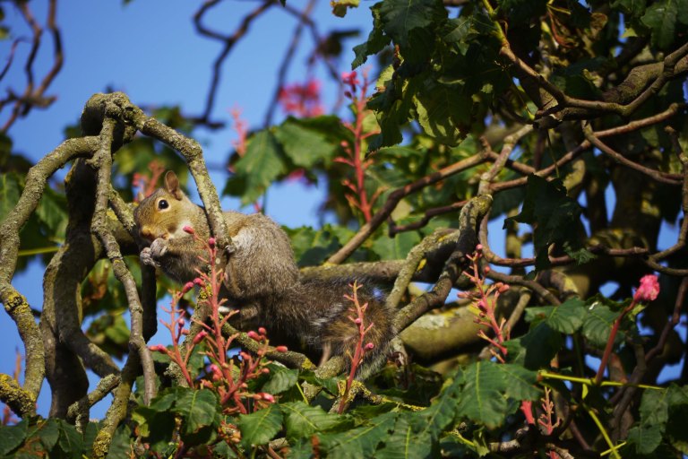 A few days ago I spotted a squirrel stuffing himself with seeds. It was poor luck I had my camera with me…